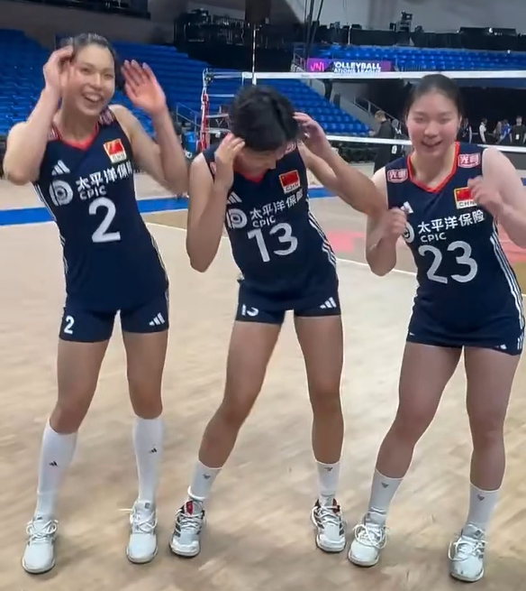 中国女排庄宇珊、董禹含与张籽萱也来登场,三位年轻选手身穿深蓝色国家队战袍,笑容满面地扭起腰、摇摆双手,跳起整齐划一的“小可爱舞”。庄宇珊在中间“带头指挥”,董禹含与张籽萱左右呼应,节奏感十足,舞步轻快,自顾自沉浸在欢乐的节奏中,活力四溢。