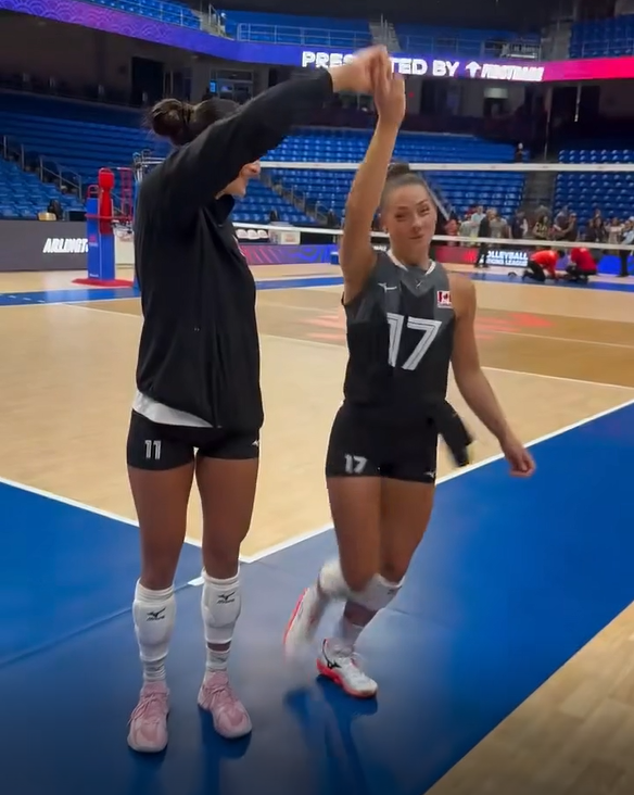 就连远道而来的加拿大女排也不缺席这场“赛后派对”。队友牵起手臂,转了一圈后自信地摆Pose,留下了俏皮的一幕。