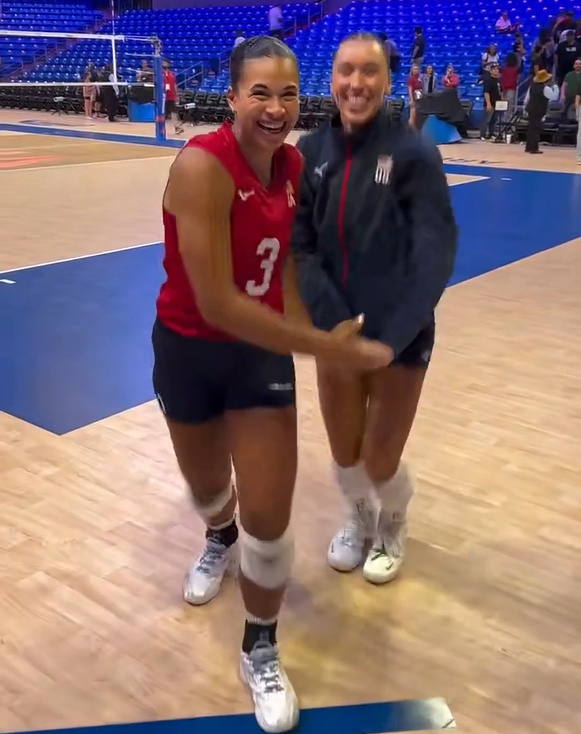 美国女排边跳边大笑,另一位穿着外套的队友则略带羞涩地跟着节奏拍手,两人默契互动,在镜头前留下了轻松搞笑的瞬间。