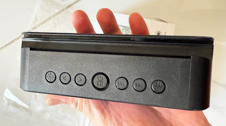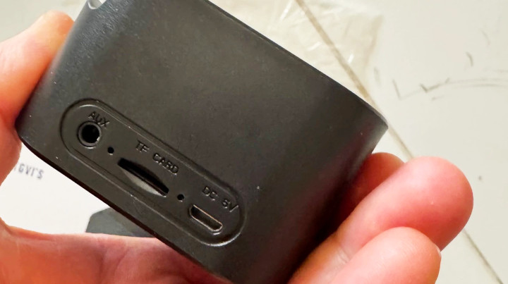 翻转机身到中框与后盖,明镜的设计与市面上常见的智能收音机一样,有拓展接口与按键。中框顶部有一排按键,包含上下曲切换、电源、菜单和设置等,按键没有背光,回弹按压的力度适中,操作起来手感很差。中框右侧是明镜的拓展接口,仅有一个aux口、microusb口、tf卡槽,没有标准usb接口。拓展使用时,tf卡槽更实用,当然,机器也支持蓝牙功能,它的连接与拓展功能更强大。