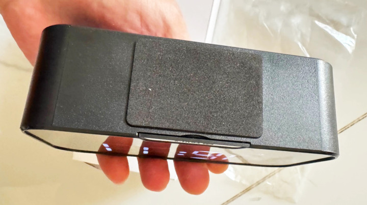 来到机身正面,明镜的设计仅有一面镜子。单玻璃全贴合镶嵌在中框上,粗看关注点全部在居中的凹凸卡槽上,仅有一个产品的logo。再看明镜的玻璃屏,镜面样式十分纯粹,反射光线,不易沾染指纹。不点亮屏幕情况下,明镜的镜面很亮,隐隐约约能辨识到内部有显示的纹路。点亮之后,呈现出一排数字,字号大,占满了屏幕,白色样式,醒目好识别。这个显示可以设置为一直显示,定时显示和点按按键显示,有点像手机的锁屏提示。